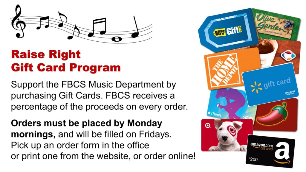 Formerly called Scrip, here’s how it works: You purchase gift cards at face value, and the FBCS Music Department receives a percentage back on every order. A little bit adds up fast! Place your orders on Monday mornings, and the gift cards will be ready for you on Friday. Order online! Here’s an info sheet about ordering online.