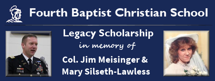 The Legacy Scholarship was created in 2017 by alumni from the class of 1983 in loving memory of two of their classmates, Jim Meisinger and Mary Silseth-Lawless. Both Jim and Mary were wonderful examples of two people who loved the Lord and others. Their classmates from high school still remember their powerful example of a servant’s heart some 34 years later and desired to create a scholarship fund, based predominantly on community service. Tax-deductible donations are received through this website and Fourth Baptist Christian School senior students are eligible to apply to receive an annual $1,000 scholarship to be awarded at graduation in May of each year. Please support this wonderful effort and give our seniors an opportunity to earn a college scholarship each year. Thank you.